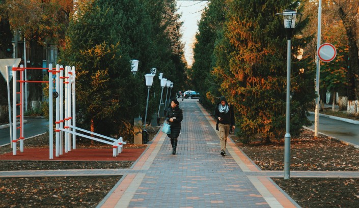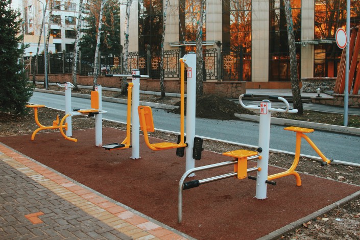 Также по Тулебаева установлены тренажеры, на которых жители и гости города могут позаниматься спортом.
