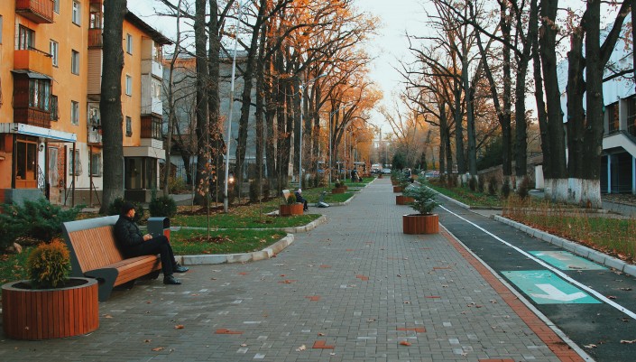 Тем временем по улице Тулебаева выложили тротуарную плитку, установили скамейки, урны и оригинальные фонари освещения, поставили клумбы с деревцами.