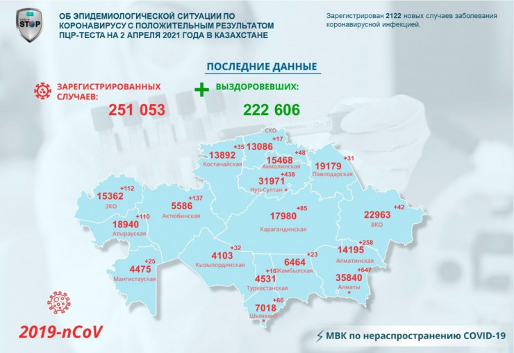 За прошедшие сутки (по данным на 2 апреля) в Казахстане было зарегистрировано 2122 новых случая заболевания коронавирусной инфекцией, передает Tengrinews.kz со ссылкой на МВК по нераспространению COVID-19.