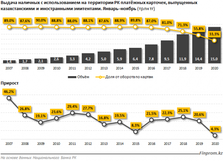 Объем наличности, выданной с карт через POS-терминалы, сократился на 39,5 процента до 1,2 триллиона тенге. А количество транзакций уменьшилось на 85,2 процента до 3,3 миллиона, что увеличило средний чек по одной транзакции с 91,4 тысячи до 372,6 тысячи тенге.