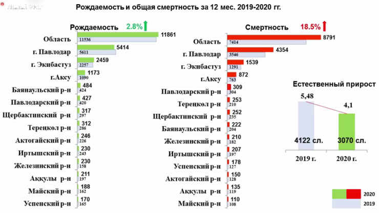 Если сравнивать 2019 и 2020 годы, рост произошел во всех городах и районах области: минимальный - в Майском районе - больше на одного человека, максимальный - в Павлодаре - разница в 818 человек. Отметим, в управлении здравоохранения сообщают, что в 2019 году в области умерло 7 414 человек.