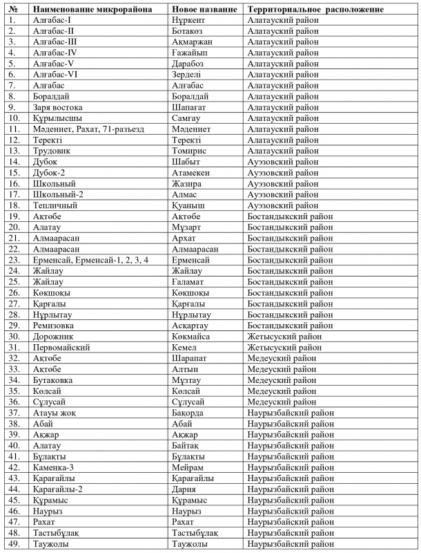 Некоторые названия микрорайонов останутся прежними. Это микрорайоны Тастыбұлақ, Таусамалы, Шұғыла, Таужолы, Құрамыс, Наурыз и другие.