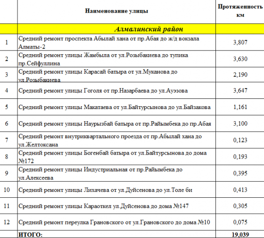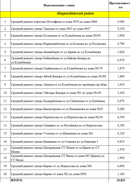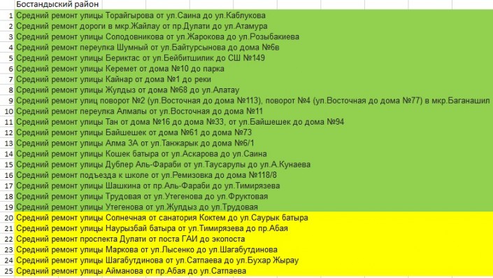 В Бостандыкском районе, наоборот, вместо изначально запланированных 20 улиц работы начали на 25. Ремонт все еще идет на шести улицах (в таблице они отмечены желтым цветом).
