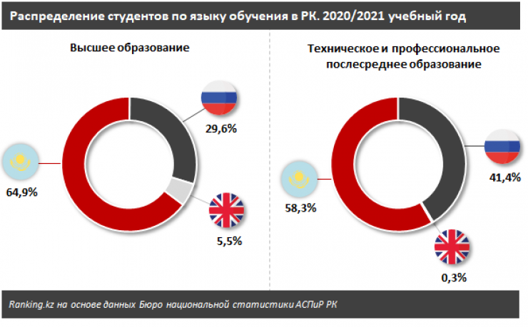 В 2020-2021 учебном году доля студентов высших учебных заведений, обучающихся на государственном языке, составила 64,9 процента, на русском - 29,6 процента, на английском языке - 5,5 процента.