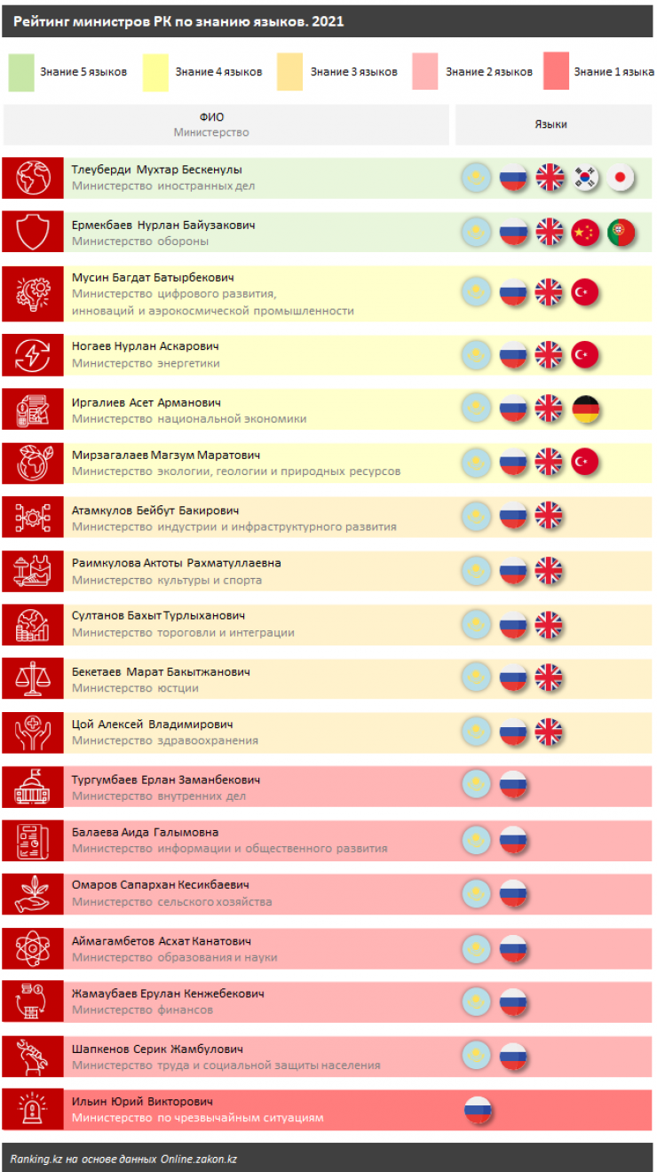 Среди глав ведомств, знающих четыре языка, министр цифрового развития, инноваций и аэрокосмической промышленности Багдат Мусин, министр энергетики Нурлан Ногаев, министр национальной экономики Асет Иргалиев и министр экологии, геологии и природных ресурсов Магзум Мирзагалиев.