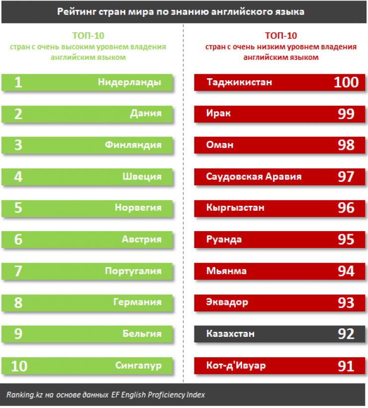 Низкий уровень владения английским языком в стране подтверждается и международными рейтингами. Так, в рейтинге стран мира по уровню владения английским языком Казахстан вошел в десятку самых слабых государств-аутсайдеров, заняв 92-е место среди 100 стран. Уровень владения английским языком в стране отмечен как "очень низкий". Среди причин слабого знания английского языка низкий уровень образования в стране, а также сравнительно слабо развитая туристская отрасль.