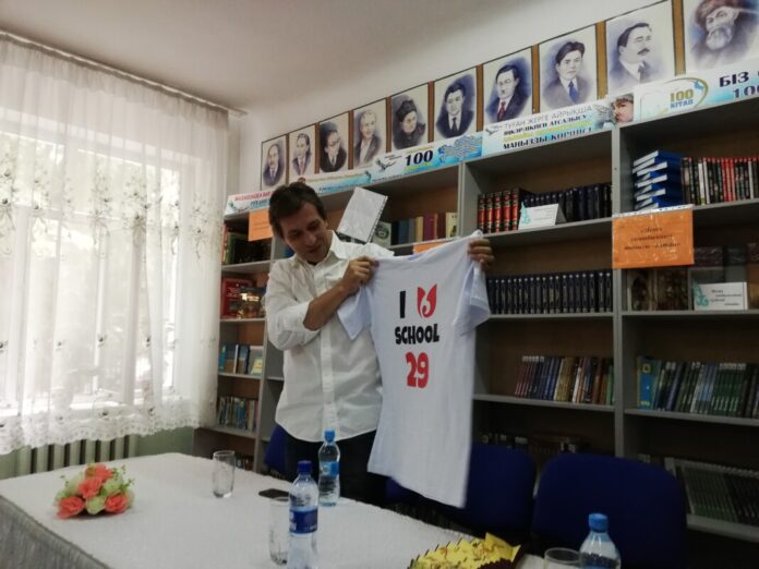 После прогулки по школе для почетного гостя устроили встречу с учениками и преподавательским составом. В завершение праздника школьники подарили Дворцевому футболку с гербом Шымкента и номером школы.