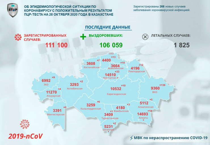 За прошедшие сутки (по данным на 28 октября) в Казахстане зарегистрировано 268 новых случаев заболевания коронавирусной инфекцией, передает Tengrinews.kz со ссылкой на МВК по нераспространению COVID-19.