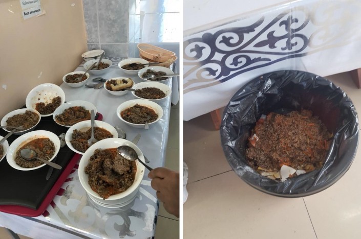 "Никто толком не ел. Не вкусная говорят. Попили компота, немного поковырялись в гречке, кто-то съел так называемые тефтели. Салат немного попробовали. После них собрали тарелки полные еды и сбрасывали все это в бочку. Целая бочка еды. Это сколько денег ушло государственных на гречку и мясо. Все эти отходы по инструкции выбрасывают, нельзя даже на корм животным. (...) Я попробовала гречку. Абсолютно невозможно есть, полсырая, без соли. Тефтели оказались перетертый хлеб с картошкой покрытый тонким слоем чего-то похожего на фарш. Салат капусту с морковью тоже невозможно есть. Ни соли, не заправленная маслом. Просто что-то наструганное и не свежее. Компот оказался коричневой жидкостью со вкусом воды. Лишь хлеб был съедобным. Его дети и ели только и просили добавки хлеба. Ушли все голодные. Малыши 2-3 классы", - прокомментировала астанчанка (орфография и пунктуация автора сохранены).