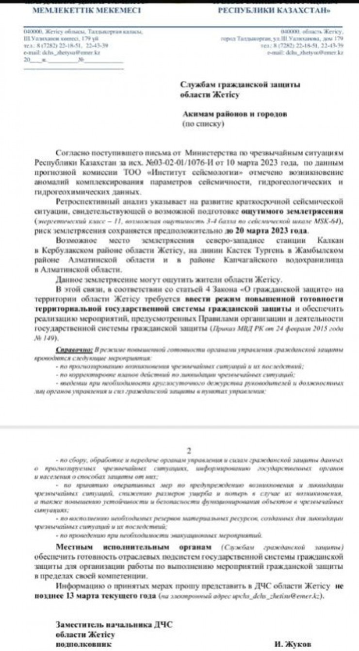 Ретроспективный анализ указывает на развитие краткосрочной сейсмической ситуации, свидетельствующей о возможной подготовке ощутимого землетрясения (энергетический класс - 11, возможная ощутимость - 3-4 балла). Риск землетрясения сохраняется, предположительно, до 20 марта 2023 года", - говорится в документе за подписью заместителя начальника ДЧС области Жетысу подполковника Игоря Жукова.