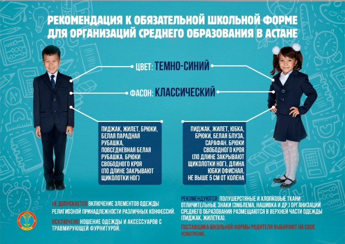 Также на школьной форме размещаются отличительные знаки (эмблема, нашивка и другое) организаций среднего образования. Они размещаются в верхней части одежды или аксессуара (пиджак, жилетка). Эскиз эмблемы можно будет получить в школе или скачать на сайте школы. Требования к школьной форме исключают одежду и аксессуары с травмирующей фурнитурой.
