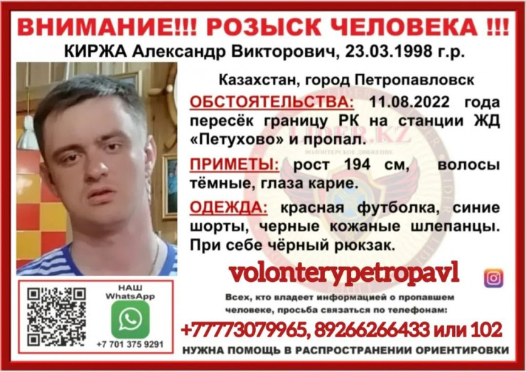 12 сентября Александр Киржа прибыл поездом в Петропавловск из Курганской области и пропал. В данное время его местонахождение неизвестно.