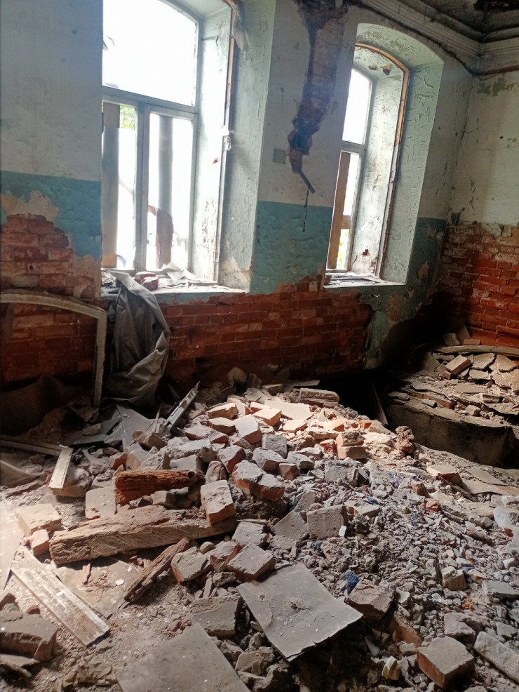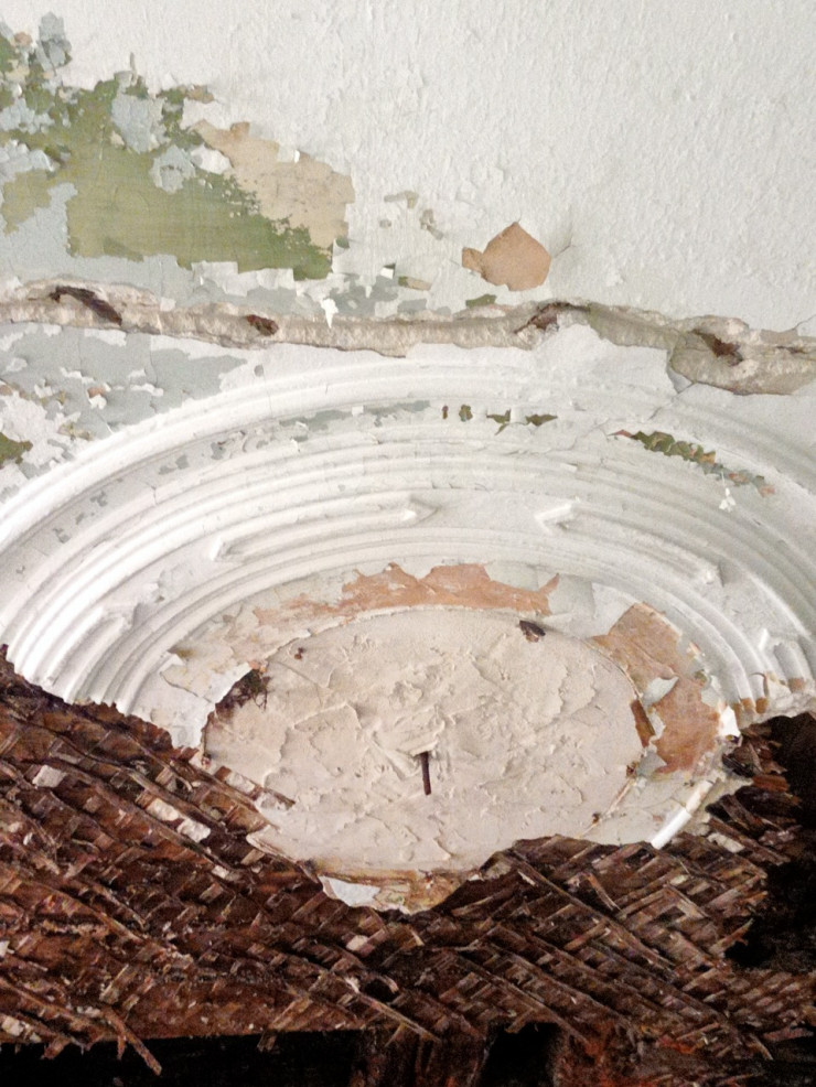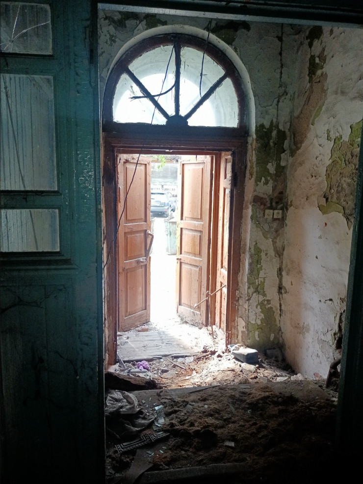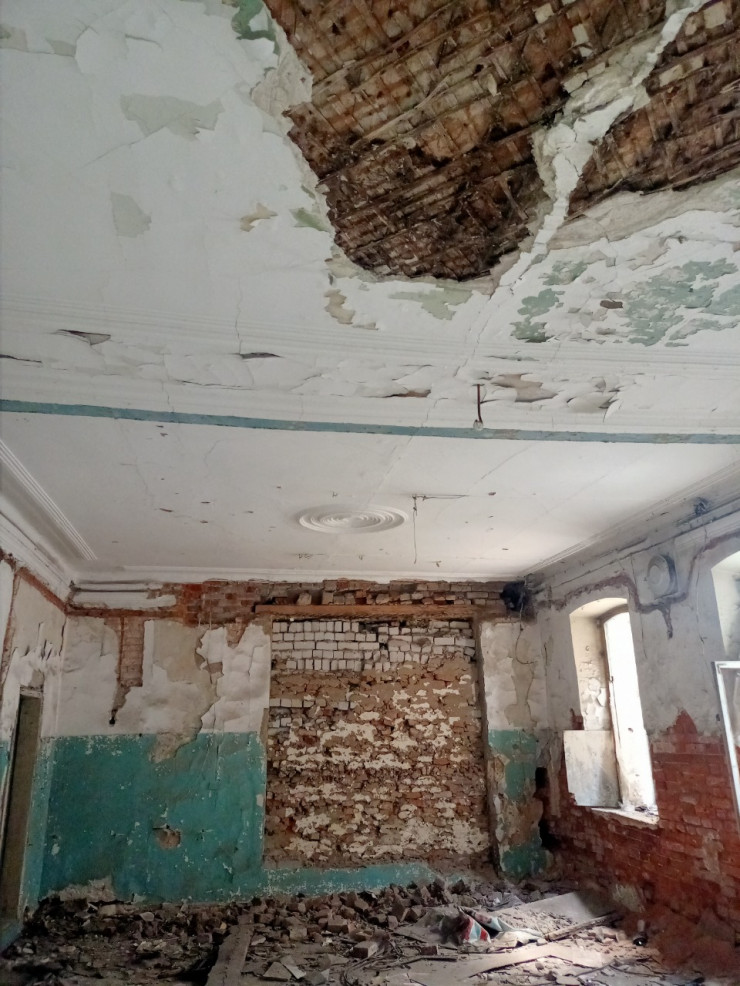Внутри здания много строительного мусора, часть конструкций потолка обвалилась, в том числе и лепнина, характерная для многих строений Семипалатинска позапрошлого столетия.