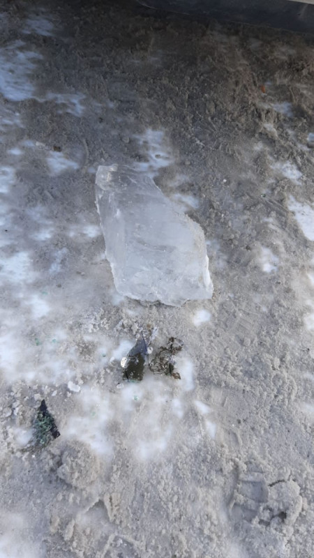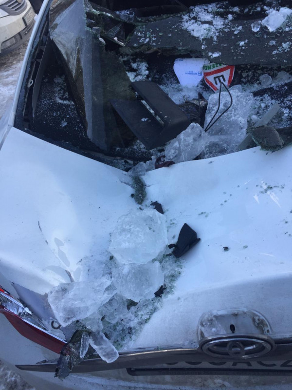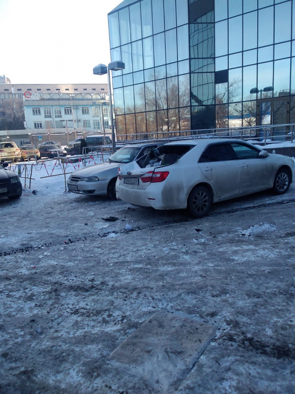 "В 11 часов приехал, оставил машину на две минуты, и мне тут же позвонили, говорят: "Хозяин Toyota Camry, выходите". Я вышел и увидел разбитую машину и куски льда рядом. Глыба льда размером где-то метр на 40 сантиметров, толщиной семь сантиметров. Знаете, мне, вообще-то, очень сильно повезло, что глыба льда не упала на меня и не убила. Сейчас еще падают сосульки. Охранники ЖК начали убирать машины от здания", - добавил он.