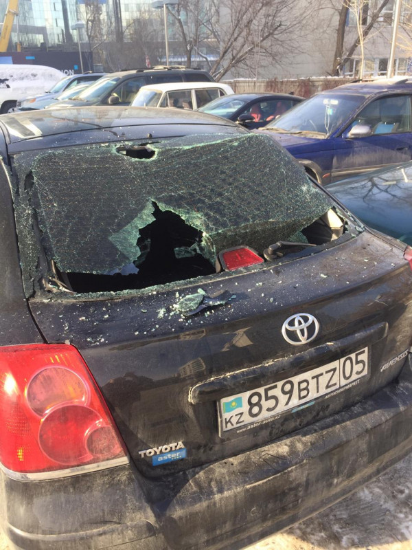 В Алматы рухнувшие с крыши 33-этажного жилого комплекса Orion сосульки разбили три авто марки Toyota, передает Tengrinews.kz.