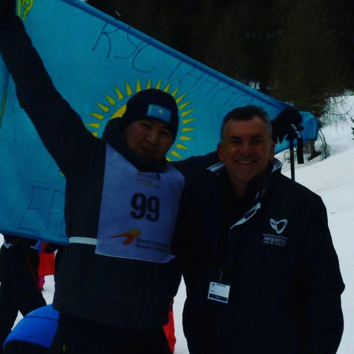 Жанибек Успанов с президентом Всемирной федерации трансплантированных спортсменов Томасом Крисом. Фото было сделано на финише после двухкилометрового забега на снегоступах
