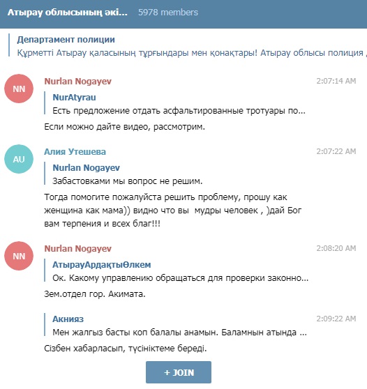 В акимате Атырауской области сообщили, что глава региона не имеет официальных аккаунтов в соцсетях. Однако Нурлан Ногаев состоит в общедоступной группе akimatatyrau в Telegram и активно участвует в решении проблем жителей области. В сообществе находятся руководители различных управлений, районных и сельских акиматов, а также правоохранительных органов. Они также реагируют на предложения и жалобы граждан. Общественный чат запущен еще в сентябре 2017 года, сейчас в нем состоит около шести тысяч участников.