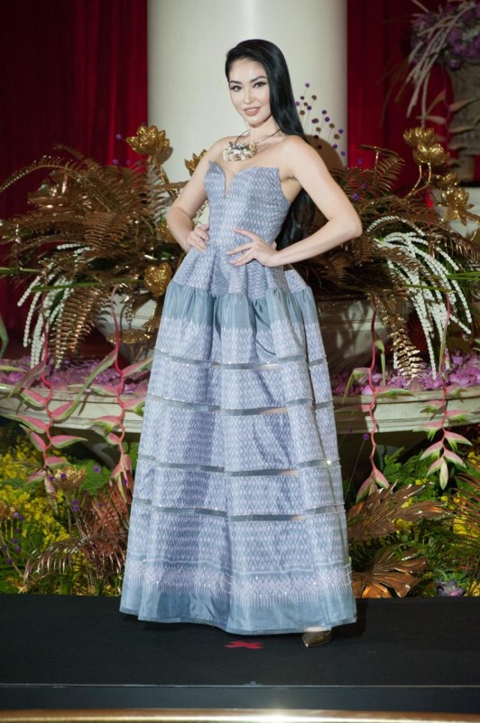 Также состоялся показ вечерних платьев. Сабина Азимбаева вышла на подиум в элегантном платье со шлейфом.