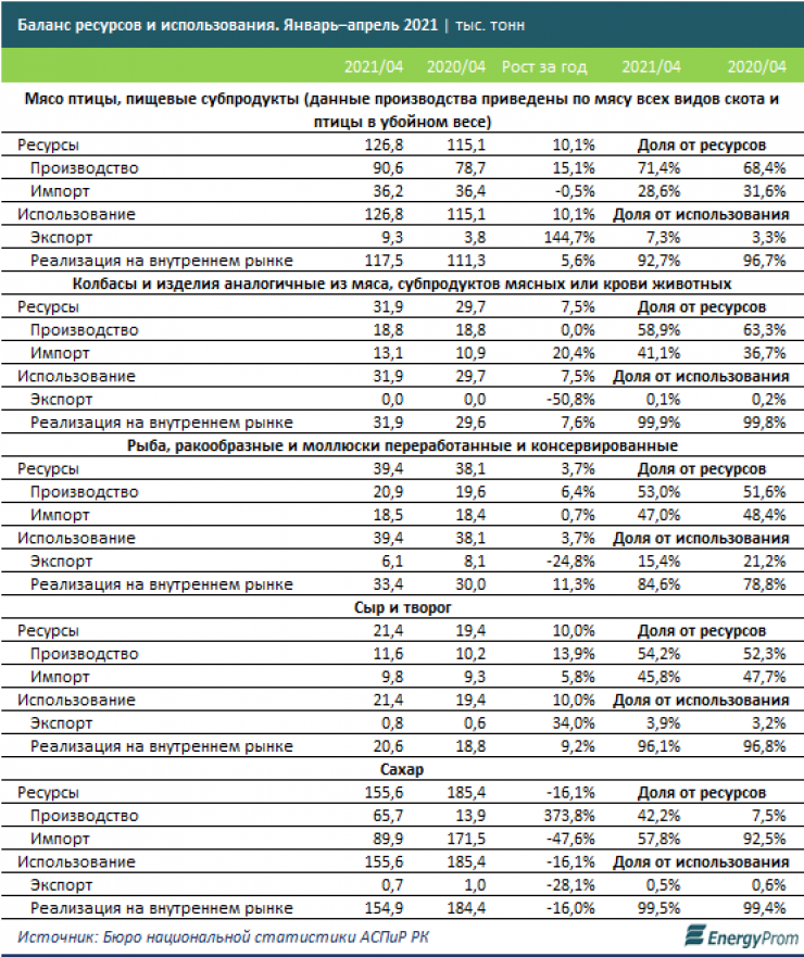 По данным аналитиков, за январь – апрель 2021 года отечественные компании обеспечили спрос на сахар всего на 42,2 процента. Уровень обеспеченности спроса на колбасы и аналогичные изделия из мяса сократился до 58,9 процента, против 63,3 процента годом ранее. По итогам четырех месяцев производство в секторе осталось на прошлогоднем уровне, при этом импорт вырос на 20,4 процента, до 13,1 тысячи тонн.
