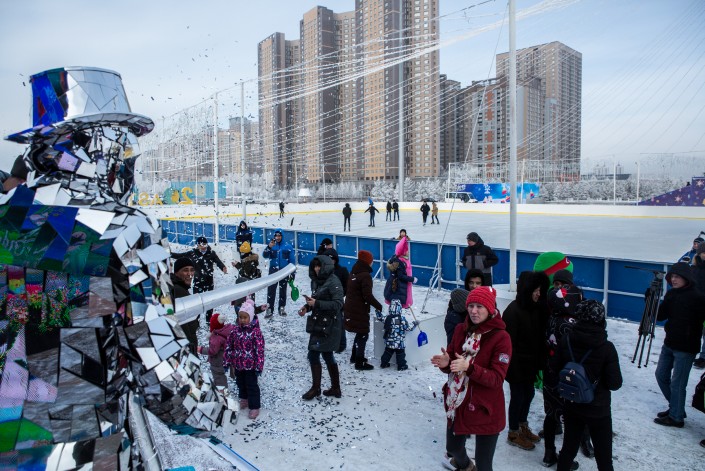 Здесь также установлена новогодняя елка высотой 15 метров, организованы пункты проката коньков и точки горячего питания. Входная группа и территория для отдыха оформлены малыми архитектурными формами.