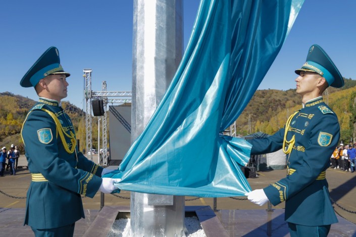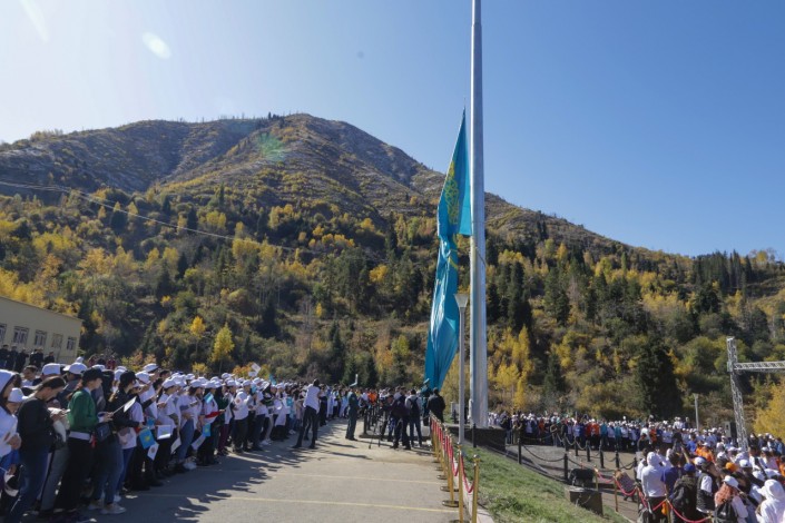 Вблизи высокогорного катка "Медеу" установили самый большой в Алматы государственный флаг Казахстана, передает Тengrinews.kz.