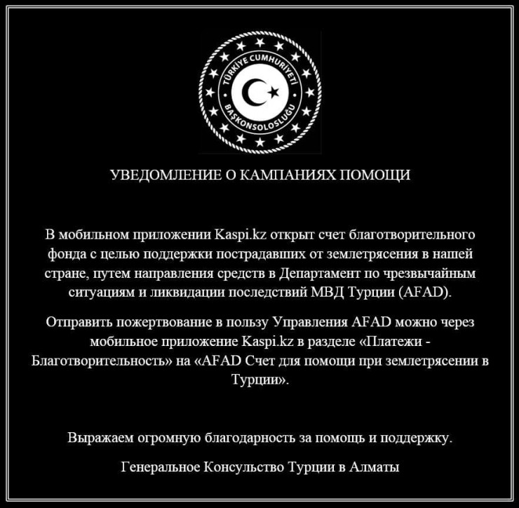 В мобильном приложении Kaspi.kz открыт счет благотворительного фонда с целью поддержки пострадавших от землетрясения в Турции путем направления средств в Департамент по чрезвычайным ситуациям и ликвидации последствий МВД Турции (AFAD).