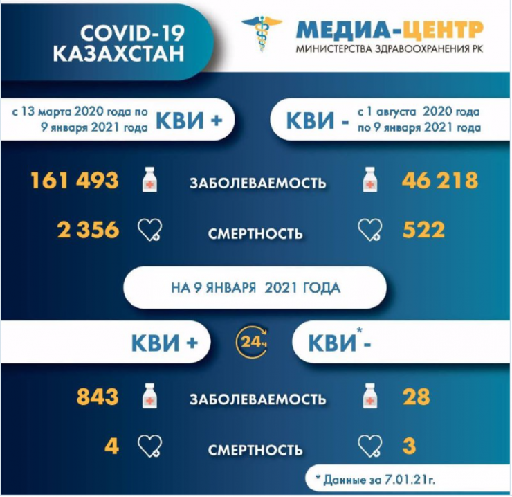 За прошедшие сутки (по данным на 8 января) в Казахстане зарегистрировано 843 новых случая заболевания коронавирусной инфекцией.