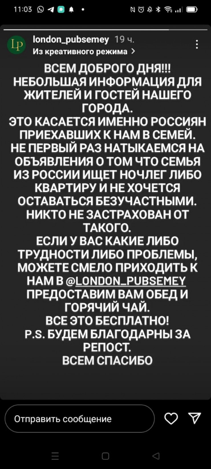 "Не первый раз натыкаемся на объявления о том, что семья из России ищет ночлег либо квартиру, и не хочется оставаться безучастными. Никто не застрахован от такого. Если у вас какие-либо трудности либо проблемы, можете смело приходить к нам. Предоставим вам обед и горячий чай. Все это бесплатно. Будем благодарны за репост ", - говорится в сообщении.