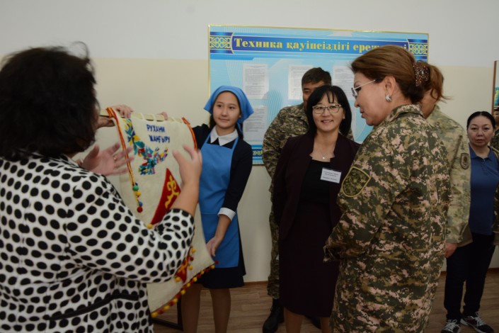 В частности, спецшколу посетили председатель комитета по международным отношениям, обороне и безопасности Сената Дарига Назарбаева, сенаторы Дархан Калетаев, Тулеубек Мукашев и аким Мангистауской области Ералы Тугжанов. Они прибыли на встречу в камуфляжной форме.