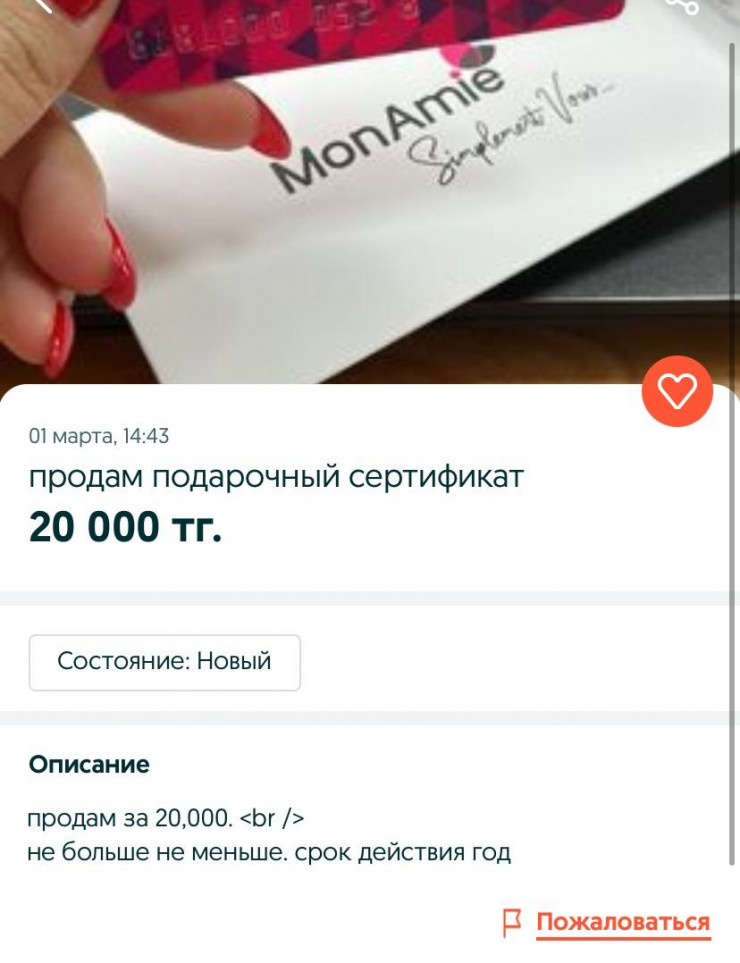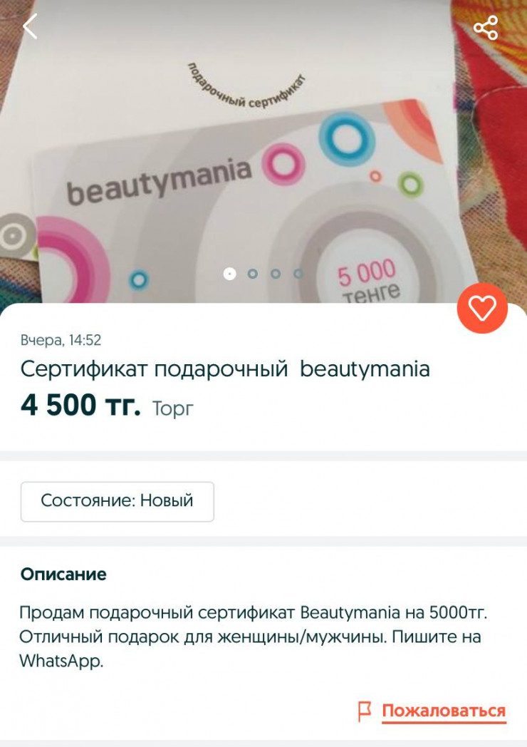 Авторы объявлений предлагают приобрести сертификат по заниженным ценам. К примеру, сертификат стоимостью 10 тысяч тенге счастливая обладательница предлагает приобрести за 8 тысяч.