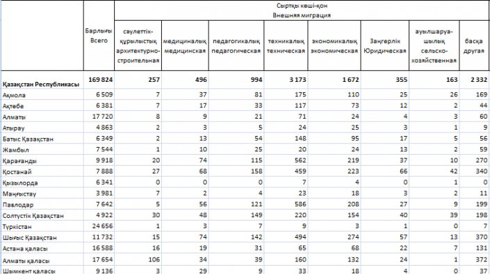 С точки зрения специальностей больше всего из Казахстана уехало людей технических профессий - 3 123 человека. Кроме того, среди уехавших есть 1 672 экономиста, 994 педагога, 496 медиков, 355 юристов, 257 архитекторов и строителей и 163 сотрудника отрасли сельского хозяйства.