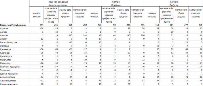 В разрезе имеющегося образования из 15 399 уехавших в страны СНГ казахстанцев старше 16 лет у 4 797 есть высшее образование, 3 828 человек имеют среднее профессиональное образование, 2 006 человек - общее среднее образование, 1 068 - основное среднее образование.