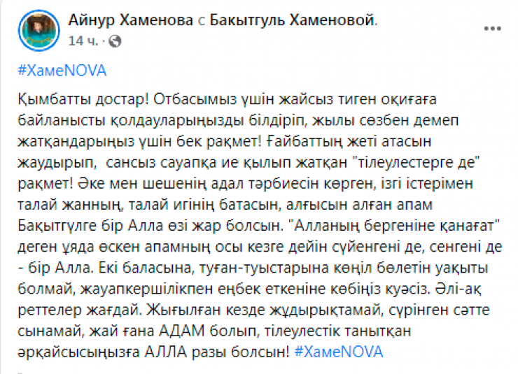 "Своими добрыми делами моя сестра заслужила немало благодарности. Пусть Аллах хранит ее! Она живет, довольствуясь тем, что посылает Всевышний. Аллах для нее и опора, и вера. Многие из вас видели, как она трудилась, не уделяя достаточно времени своим двум детям и родным. Ситуация исправится. Всем, кто желает ей добра, большое спасибо", - написала Айнур Хаменова. Ее слова приводит Azattyq Rýhy.