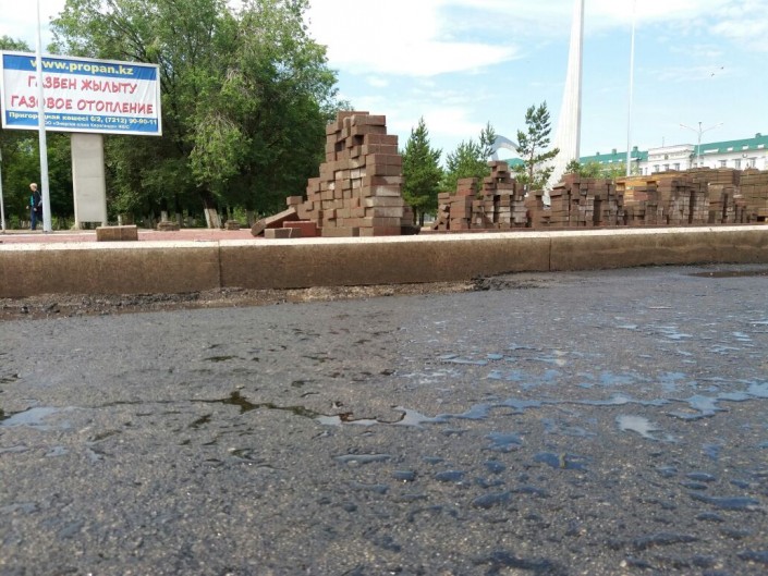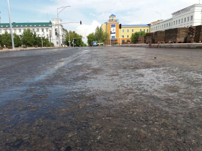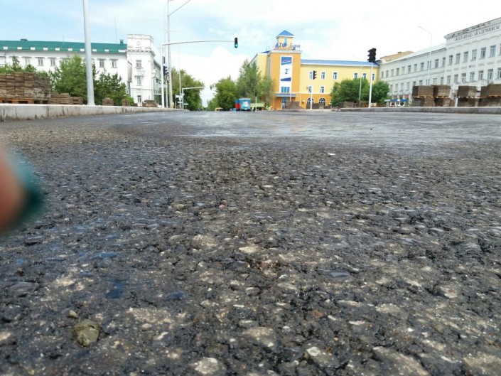 Видео в сети разместил пользователь под именем Данияр Еникей. Он подписал кадры словами: "В Караганде кладут асфальт несмотря на дождь". На кадрах запечатлена техника, которая раскатывает асфальт в дождь. Над асфальтом вьется пар. Корреспондент Tengrinews.kz побывал на площади Гагарина, которая сейчас перекрыта из-за ремонта. Здесь множество спецтехники, укладка асфальта уже не производится. Идет дождь. Асфальт очень теплый, немного рыхлый и подошва обуви слегка прилипает к нему.