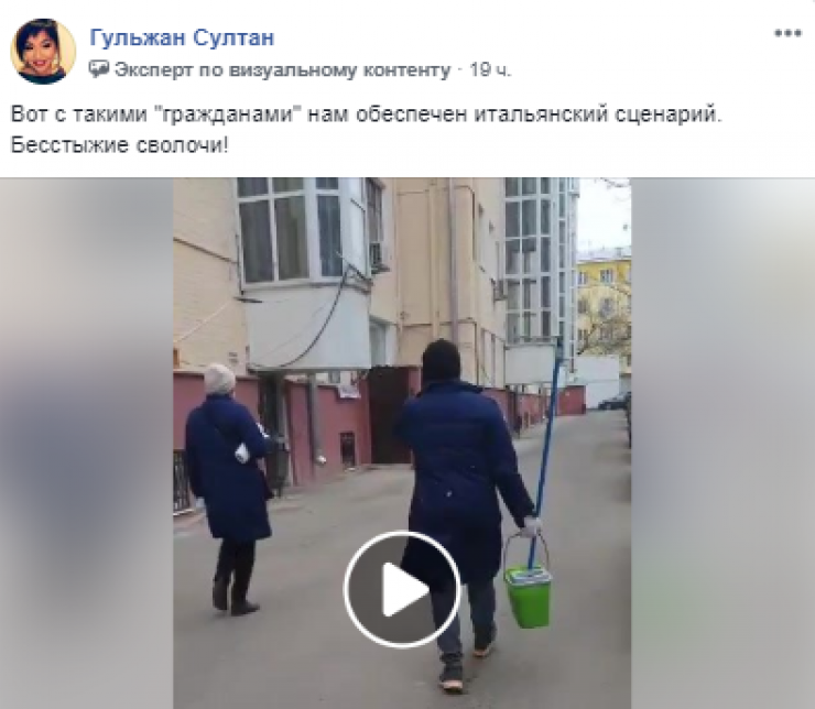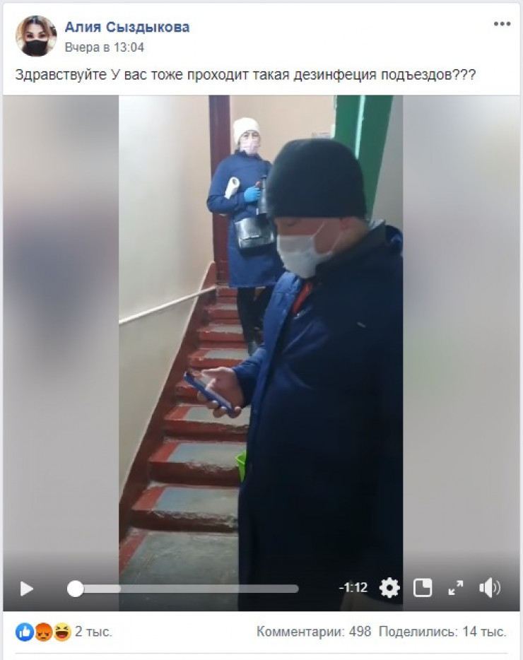 "Пользователь Facebook опубликовала видео, которое якобы было снято в одном из домов в Нур-Султана, что представители КСК не дезинфицируют подъезд, а делают фотографии. Это ложная информация. Этот случай произошел в Москве, на телеканале НТВ вышел сюжет с кадрами этого подъезда. Я призываю граждан не распространять ложную информацию и не вводить людей в заблуждение. За распространение ложной информации предусмотрена ответственность", - сказала пресс-секретарь акима Нур-Султана Акмарал Олжабаева.
