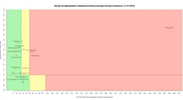 Один регион перешел в "желтую" зону, согласно матрице оценки эпидемиологической ситуации в регионах Казахстана на 11 января, передает корреспондент Tengrinews.kz.