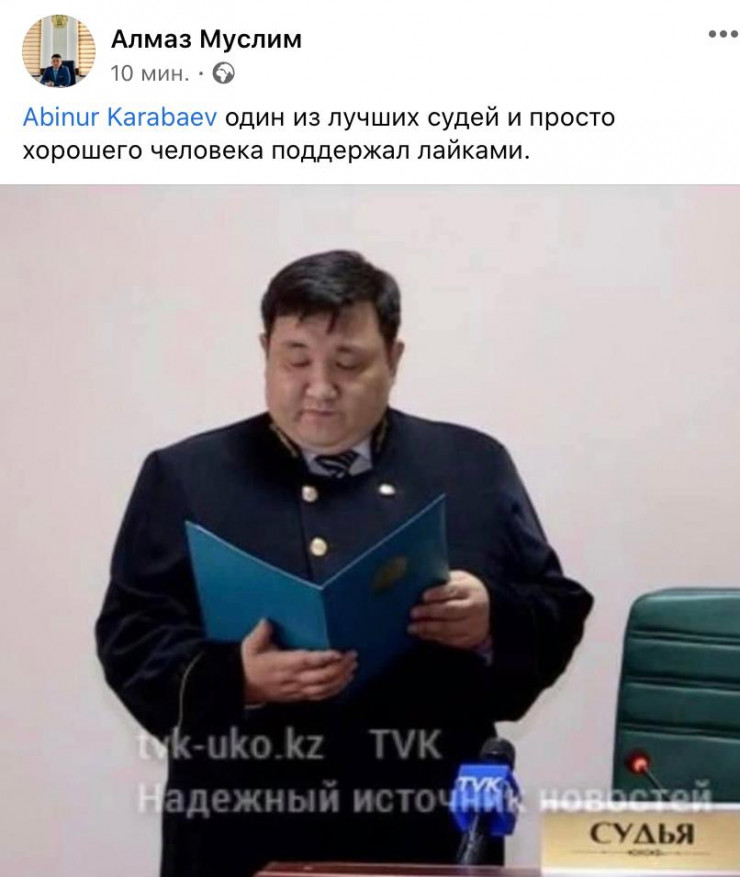 Судья СМУС Шымкента Абинур Карабаев разместил на своей странице в Facebook пост, в котором говорит о коллегах, не желающих ставить ему лайки и оставлять комментарии, передает Tengrinews.kz со ссылкой на Elitar.kz.