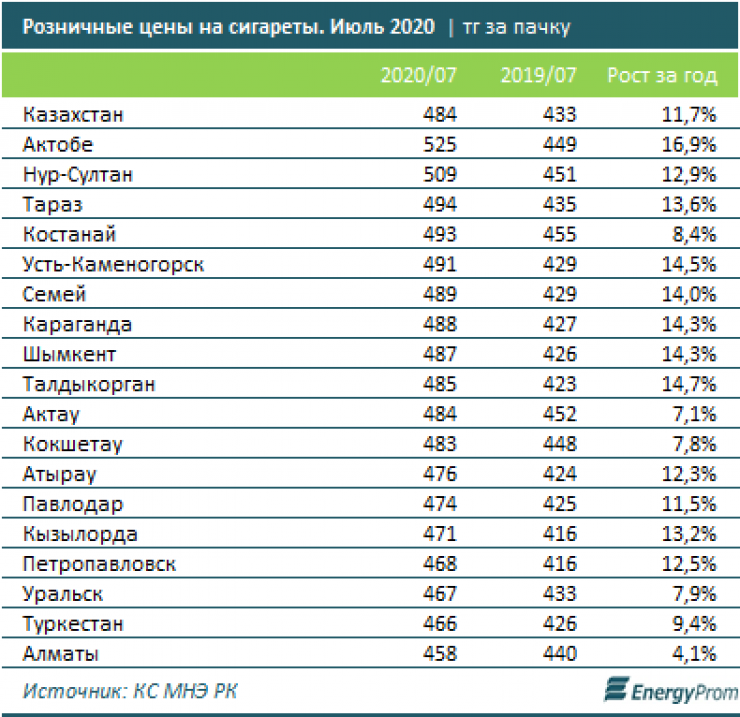Дороже всего пачка сигарет обходилась жителям Актобе: 525 тенге - на 16,9 процента больше, чем год назад. Дешевле всего - алматинцам: 458 тенге, годовое удорожание составило 4,1 процента.