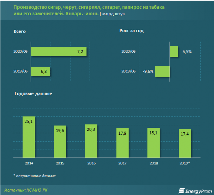 За январь – июнь 2020 года в стране произвели 7,2 миллиарда сигарет, сигар, папирос и прочих табачных изделий, это на 5,5 процента больше, чем годом ранее. В денежном выражении табачных изделий было выпущено на сумму 84,7 миллиарда тенге.