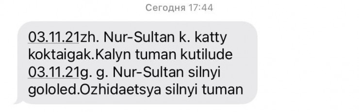 О непогоде астанчан предупреждают в SMS-рассылке от 112.