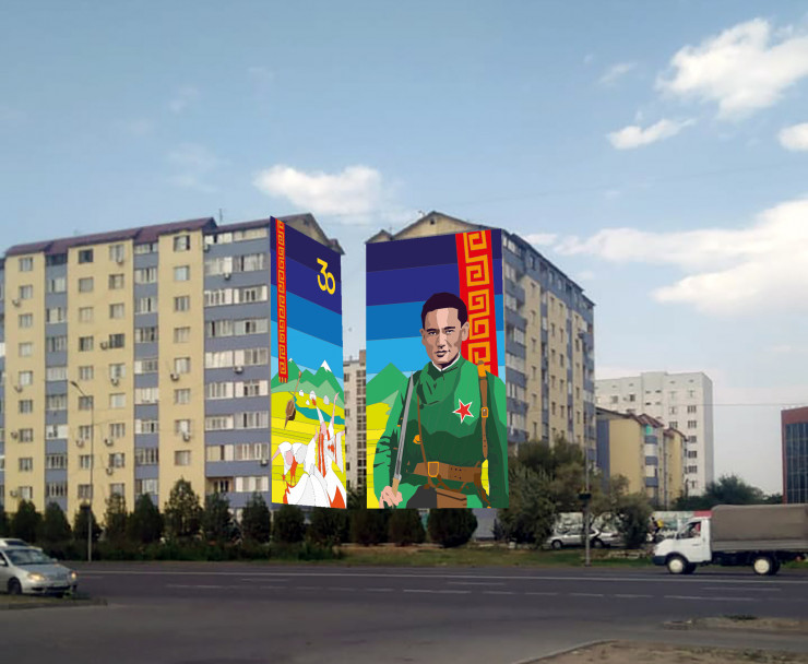 В Алматы на углу улиц Момышулы и Рыскулова на фасаде двух домов появился новый мурал, изображающий казахстанского героя Великой Отечественной Бауыржана Момышулы. Молодые художники Батыр Садвакасов и Галымжан Балсары заявили, что они разработали эскиз для него, однако в итоге мурал был нарисован без их ведома и участия.