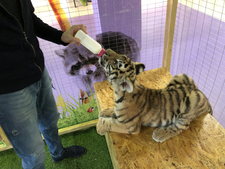 В вольерах, где содержатся дикие кошки, кафельный пол заменили искусственным газоном. Корреспонденту Tengrinews.kz разрешили покормить тигренка из бутылочки.
