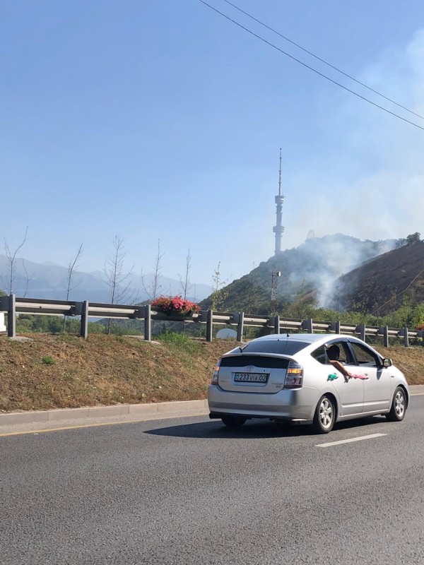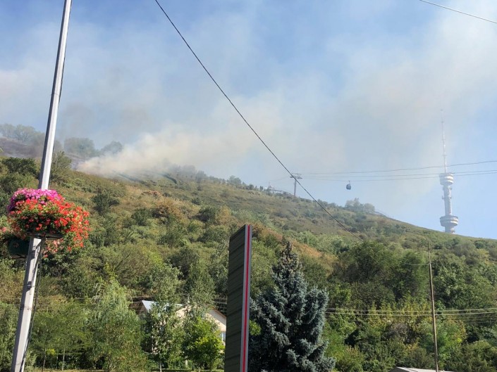 "Приблизительно на расстоянии одного километра от телебашни Көк-төбе происходит горение сухостоя на склоне горы на предварительной площади 1 гектар. Угрозы населенным пунктам нет, так как произведена опашка по периметру", - отметили в ведомстве.