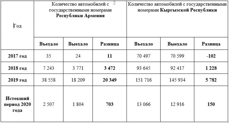 В ответ на официальный запрос редакции в ведомстве сообщили, что в период с 1 января 2017 года на территорию страны въехали 31 695 автомобилей с армянскими и кыргызскими номерами под управлением граждан Казахстана. Отметим, что эта цифра взята с учетом разницы въездов и выездов. В целом, статистика по годам и странам выглядит следующим образом: