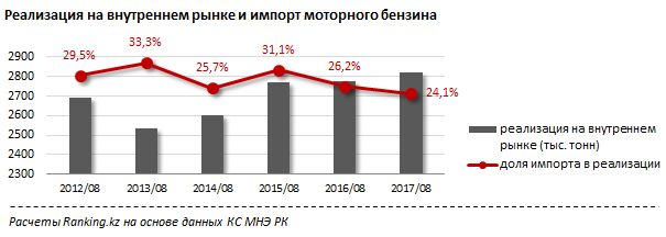 Однако текущего ускорения производства недостаточно, чтобы удовлетворить спрос на топливо со стороны казахстанских автолюбителей в полной мере. За январь-август 2017 года на внутреннем рынке было реализовано 2,8 миллиона тонн моторного бензина, или на 47,5 тысячи тонн больше, чем за аналогичный период 2016 года. В прошлом году (январь-август) годовой прирост потребления бензина составил всего 3,1 тысячи тонн.