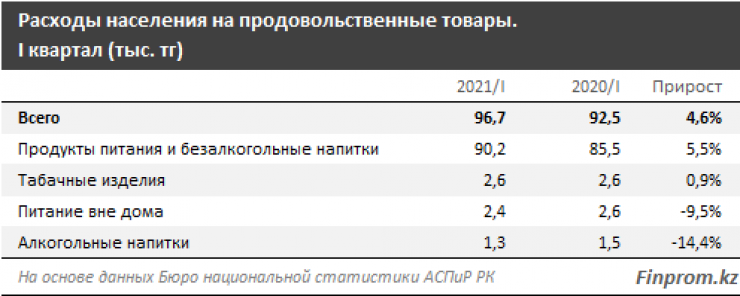 В первом квартале 2021 года расходы казахстанцев на продовольственные товары составили 96,7 тысячи тенге на душу населения - на 4,6 процента больше в стоимостном выражении, чем годом ранее.