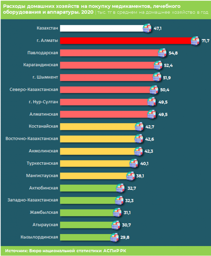 За 2020 год каждое домохозяйство страны в среднем потратило на покупку медикаментов, лечебного оборудования и аппаратуры 47,1 тысячи тенге. Это на 62,6 процента больше, чем годом ранее.