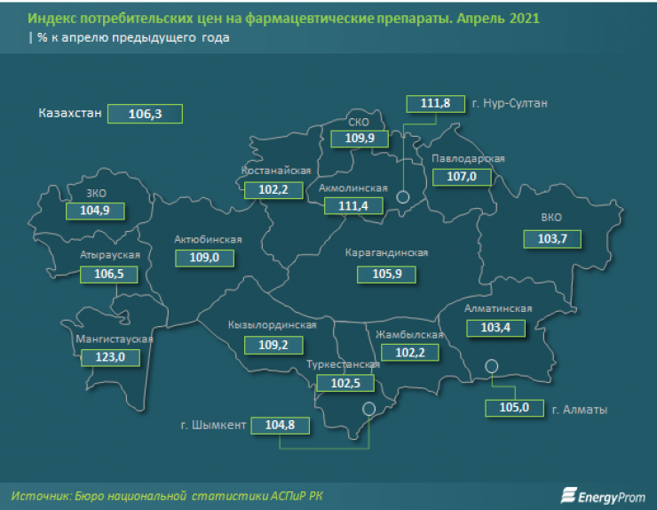"Сильнее всего рост цен ощутили жители Мангистауской области - сразу на 23 процента за год. По годовому росту цен также "лидируют" столица (плюс 11,8 процента) и Акмолинская область (11,4 процента). Среди основных фармацевтических препаратов наибольший рост цен в годовой динамике наблюдается у таких препаратов, как пятипроцентный спиртовой раствор йода, "Эссенциале форте Н", 90%-ный этиловый спирт, "Корвалол", "Аквалор Форте спрей". Падение цен было отмечено для таких препаратов, как "Гипотиазид", ацетилсалициловая кислота", - пишут аналитики.