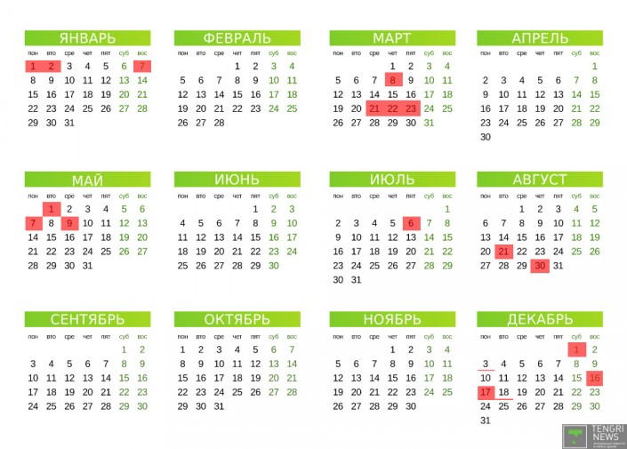 Дни, в которые отмечаются национальные и государственные праздники в Республике Казахстан, признаются праздничными днями в соответствии с трудовым законодательством Республики Казахстан. Праздничные дни в Республике Казахстан являются нерабочими днями. При совпадении выходного и праздничного дней выходным днем является следующий после праздничного рабочий день. В календаре эти дни отмечены красным подчеркиванием.