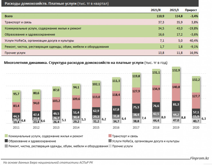 Во втором квартале текущего года расходы казахстанских семей на платные услуги составили в среднем 110,9 тысячи тенге на домохозяйство, минус 3,4 процента к первому кварталу. Это 16,4 процента от всех расходов семей против 17,8 процента в предыдущем квартале.